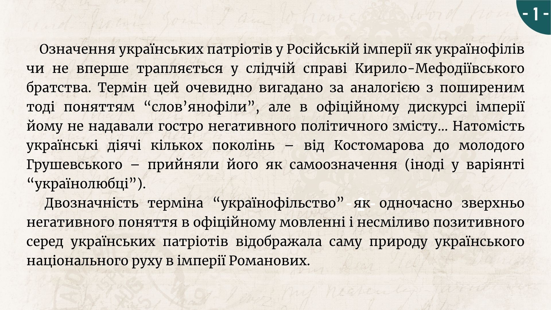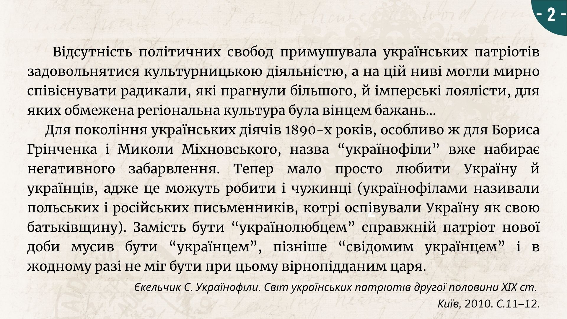 3. Прочитайте уривок із праці Сергія Єкельчика «Українофіли. Світ українських патріотів другої половини ХІХ ст.» (Київ, 2010). Коли і за яких умов виникло поняття «українофіли»? Як ставлення до цього поняття як до самоозначення різних поколінь діячів свідчить про розвиток українського національного відродження? Про які етапи українського національного руху дізналися на уроці? Про які з них ідеться в поданому уривкові? За якими ознаками ви їх визначили? Спираючись на поданий уривок та набуті знання, витлумачте поняття «українофільство». .