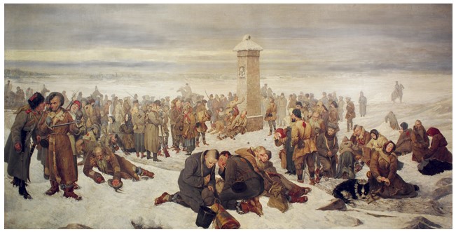 Роздивіться картину Олександра Сохачевського «Прощання з Європою» (1890–1894 рр.), на якій зображено польських повстанців на шляху до Сибіру, їхню зупинку на кордоні між Європою та Азією, на Уралі. Яку ідею прагнув утілити автор картини, який сам був учасником повстання, за що отримав 20 років каторги (зобразив себе біля стовпа з правого боку кордону)? Витлумачте назву картини. Який символічний зміст вона має?
