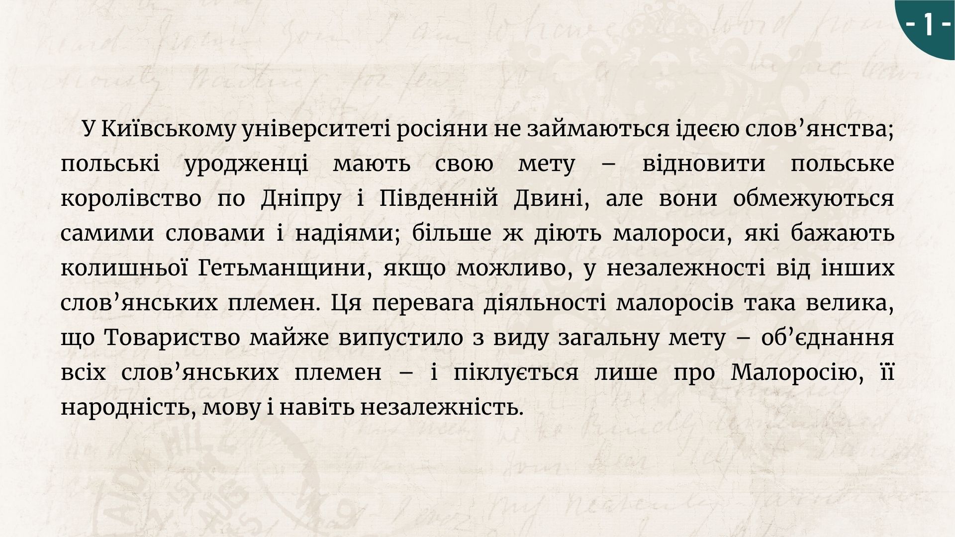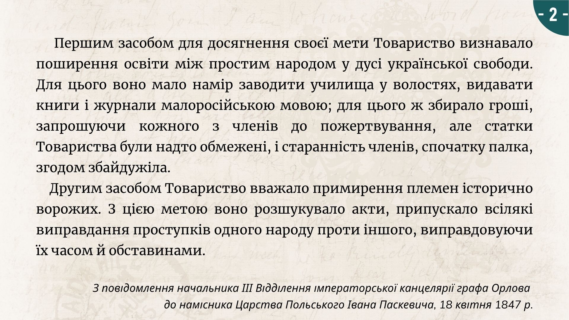 3. Прочитайте уривок з повідомлення начальника ІІІ Відділення імператорської канцелярії (орган політичного розшуку й управління жандармською поліцією в Російській імперії) графа Олексія Орлова до намісника Царства Польського Івана Паскевича (18 квітня 1847 р.). Яку мету, за словами шефа жандармів, ставили перед собою кирило-мефодіївці? Якими засобами планували її досягти? Чому члени товариства зазнали переслідувань? Що найбільше лякало владу в їхній діяльності. Підвередіть свою відповідь рядками з джерела.