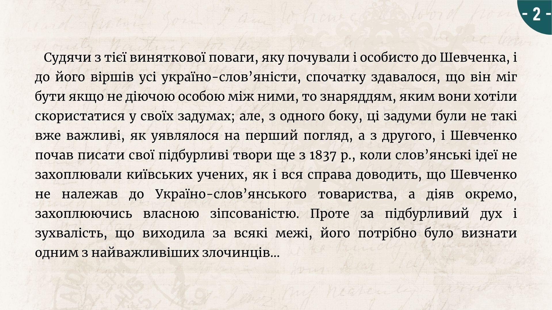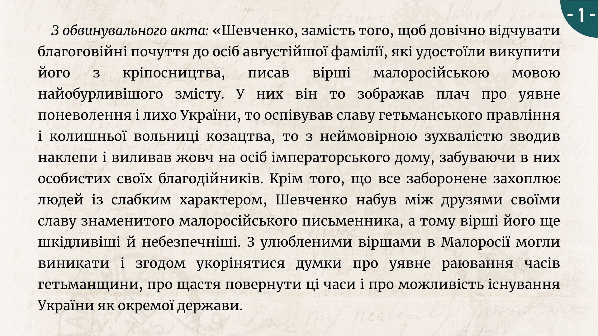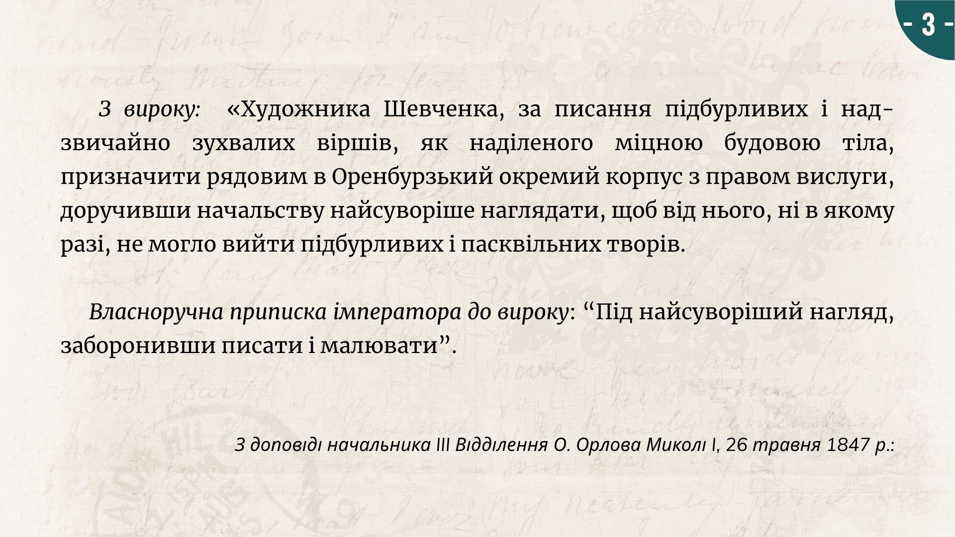 4. Прочитайте уривок з доповіді начальника ІІІ Відділення Олексія Орлова російському імператорові Миколі І (26 травня 1847 р.). Чому Т. Шевченко отримав найсуворіше покарання серед кирило-мефодіївців – заслання в солдати на 10 років? Чому Т. Шевченкові було заборонено писати і малювати? Як про мотиви вироку поетові свідчить фраза «…замість того, щоб довічно відчувати благоговійні почуття до осіб августійшої фамілії, писав вірші малоросійською мовою найобурливішого змісту…»?