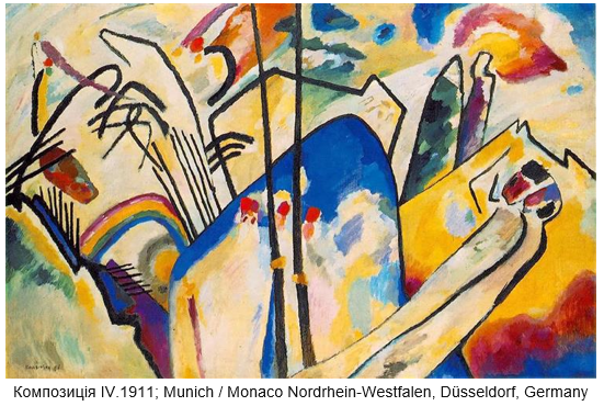 Історія створення. Картина "Композиція IV", створена Василем Кандинським, є яскравим прикладом його переходу до абстрактного живопису. Вона була написана у 1911 році і відображає його інтерес до синтезу мистецтв, зокрема музики та живопису."Композиція IV" є однією з перших робіт Кандинського, де він повністю відходить від реалістичного зображення і переходить до абстрактних форм та кольорів. Кандинський вважав, що кольори мають звукові властивості, і намагався передати музичні емоції та настрої у своїх картинах. У своїх творах він використовував синестезію - здатність бачити кольори як звуки і навпаки. "Композиція IV" демонструє його експерименти з формою, кольором та композицією, де він використовував яскраві кольори та динамічні лінії для створення відчуття руху та енергії.Ця картина стала важливою для розвитку абстрактного живопису та вплинула на багатьох художників. На картині немає чітких зображень, натомість є набір абстрактних форм та кольорів, які взаємодіють між собою. Кандинський використовує динамічні лінії та яскраві кольори, щоб створити відчуття руху та енергії. "Композиція IV" - це картина, яка запрошує глядача до роздумів про взаємодію кольору, форми та звуку, а також про можливості абстрактного мистецтва.