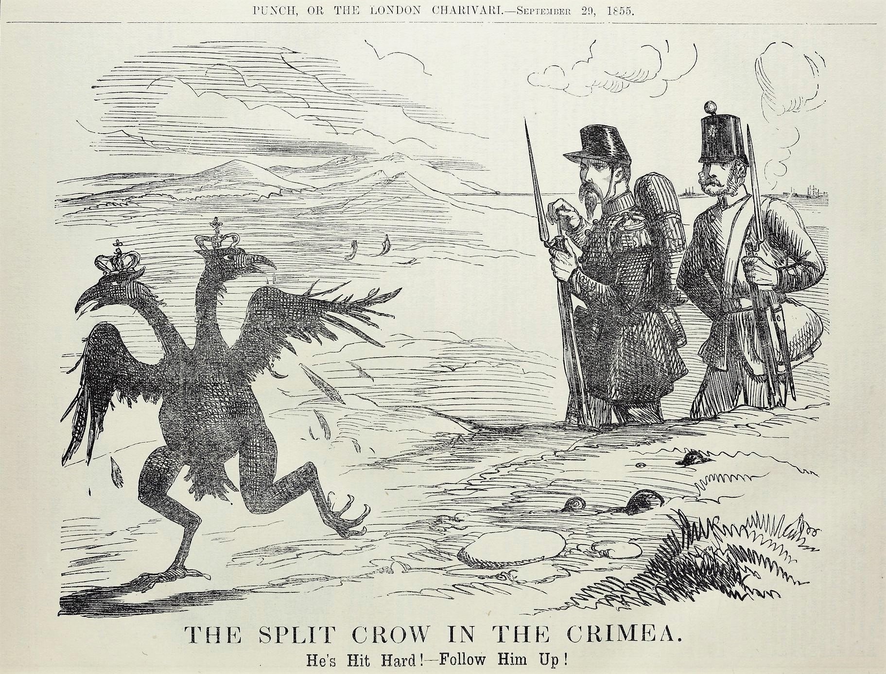 Розгляньте карикатуру «The Split Crow in the Crimea» (журнал Punch, 29 вересня 1855 р.). Чому автор карикатури зобразив Російську імперію саме так? Який образ він хотів створити? Як виглядає співвідношення сил між Росією та іншими державами на малюнку? Який висновок про місце Російської імперії у Європі першої половини ХІХ ст. можна зробити, спираючись на цю карикатуру?